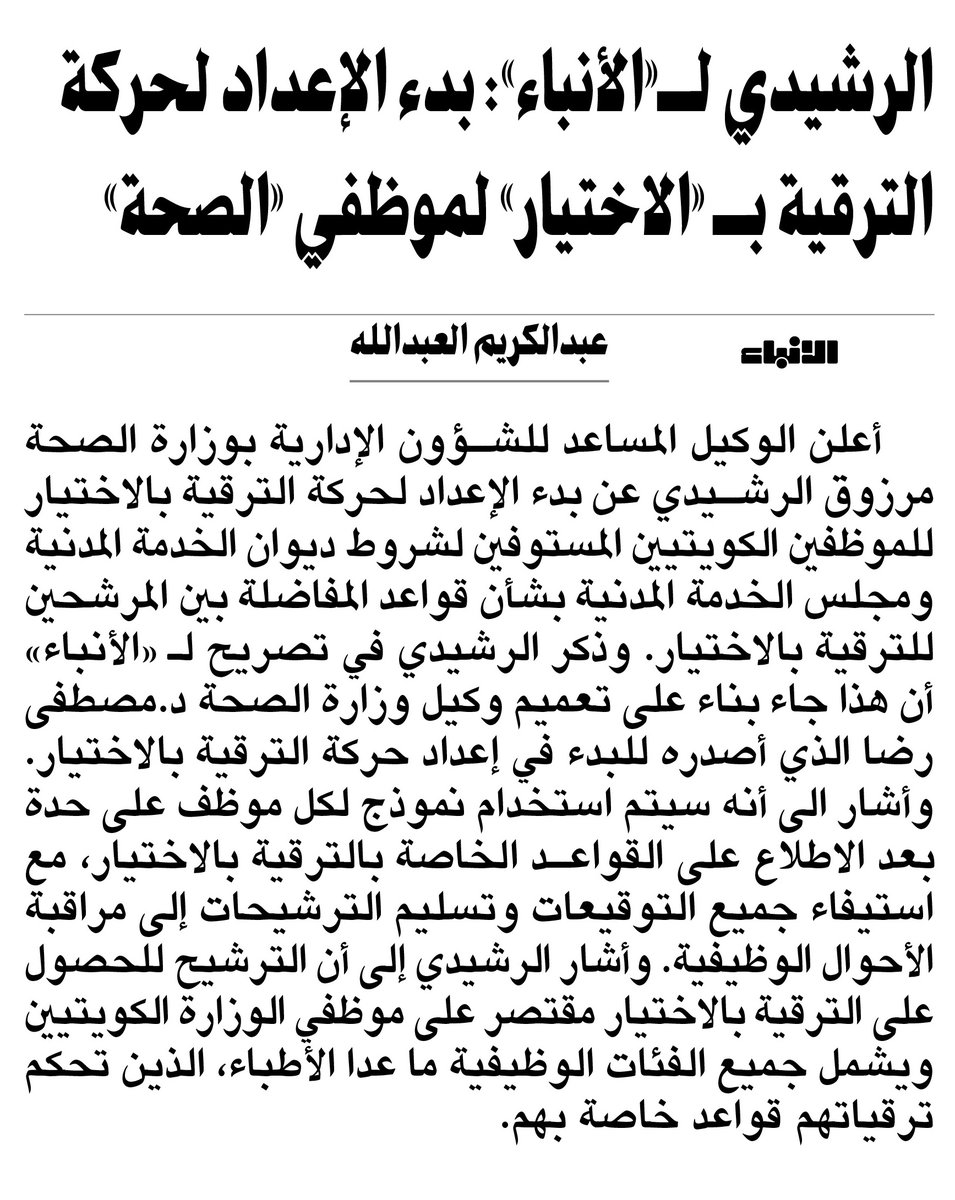صحيفة الأنباء الرشيدي ل الأنباء بدء الإعداد لحركة الترقية ب الاختيار لموظفي الصحة